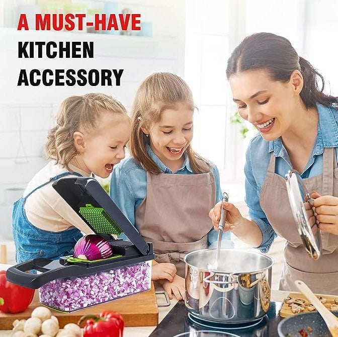 Description Vegetable Cutter Chopper and Slicer – A versatile all-in-one kitchen tool equipped with multiple blade attachments for slicing, dicing, shredding, and grating fruits and vegetables effortlessly.